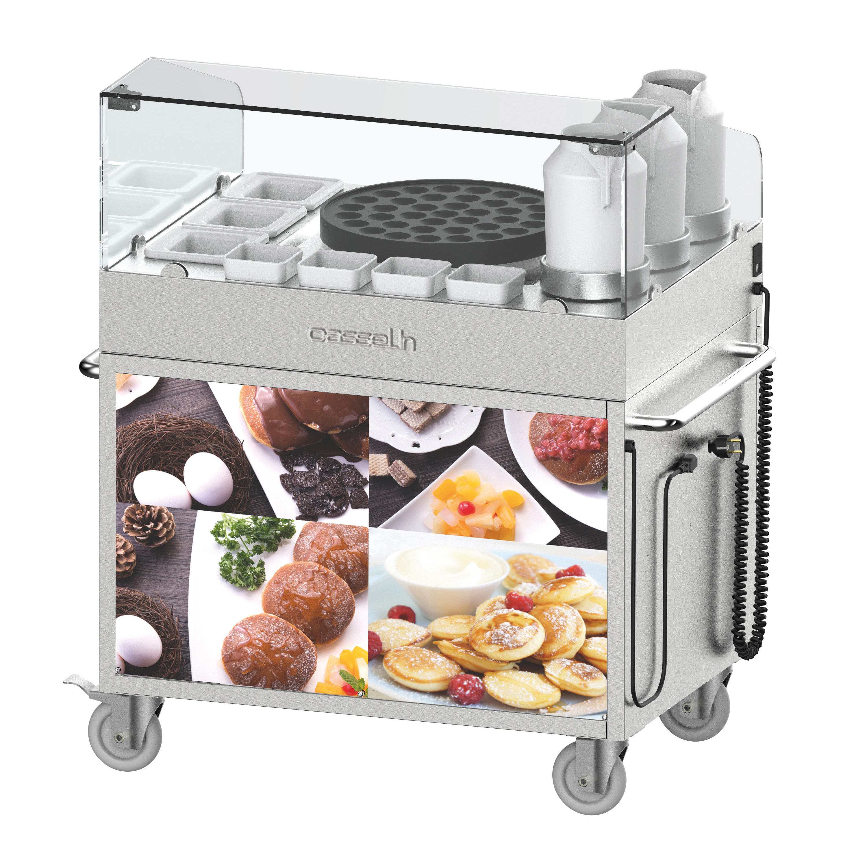 - Inklusive : 3 Kaltgelhalter, 7 Porzellanbehälter, 3 Porzellankaraffen, Poffertjes-Spaten