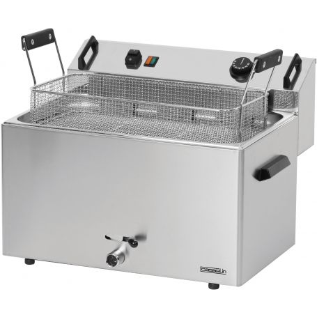 - Acier inoxydable avec cuve à angles arrondis- 1 cuve d’une contenance de 16 litres- Vanne de vidange avec sécurité- Réglage de la température de 50°C à 190°C- Technologie zone froide- Thermostat de sécurité- Dimensions panier : L 475 x P 245 x H 80 mm- Puissance : 9 000 W / 400 V- Dimensions : L 540 x P 450 x H 370 mm- Poids : 13 Kg